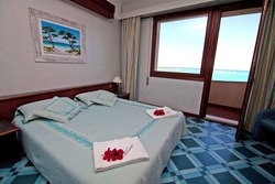 Camera family garden (su richiesta): doppio ambiente con un bagno da 4 posti letto (letti piani), disponibili senza supplemento fino ad esaurimento disponibilità; supplemento camera vista mare (su richiesta): € 20 al giorno a camera in tutti i periodi;